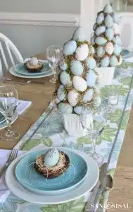Then, display several fabric eggs and bunnies in pastel hues along the table for an easy an elegant end result.